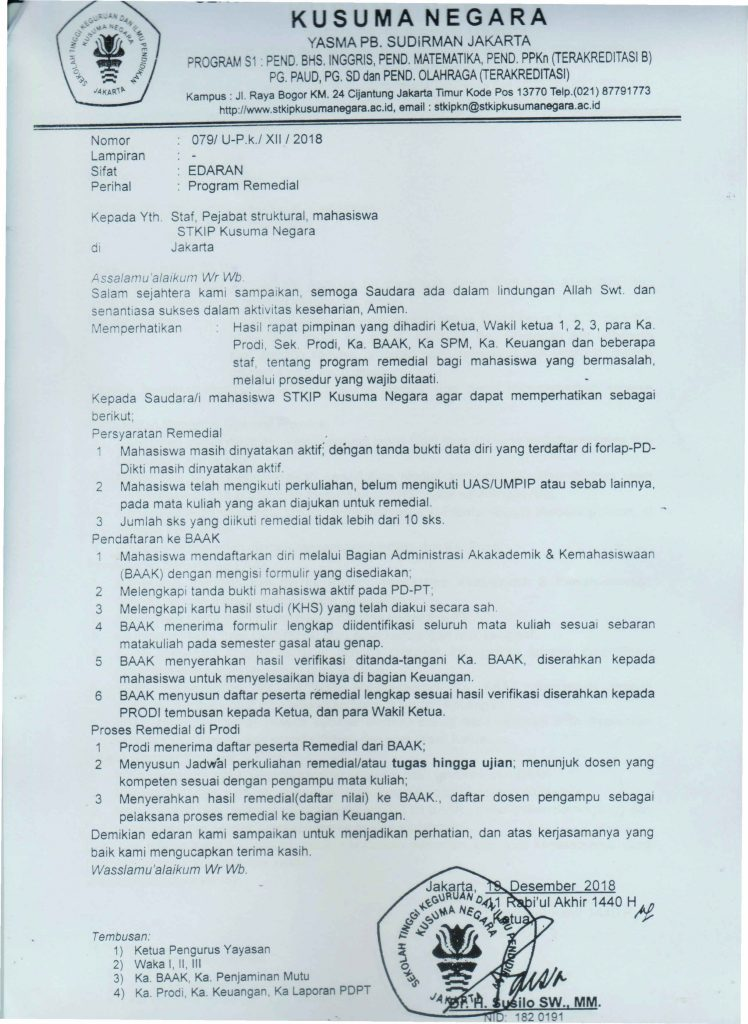 Diumumkan kepada seluruh Mahasiswa STKIP Kusuma Negara Jakarta, bahwa berdasarkan Edaran Program Remedial Nomor 079/U-P.k./XII/WR.I/I/2018. bahwa pada semester gasal TA 2023-2024 akan dilakukan program ujian Remedial dengan ketentuan sebagai berikut: